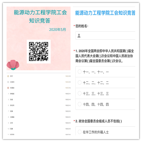 此次知识竞答活动在问卷星上进行,答题前教职工需自学两会精神、习近平总书记视察山西重要讲话精神、《新型冠状病毒感染的肺炎疫情防控知识手册》等内容,方可参加答题活动。在线答题过程中,系统生成20道题目,若回答错误,会弹出正确答案,以帮助教职工在线学习。这种活动形式受到大家普遍欢迎,全院共有53名教职工参与答题,90%的教职工答题成绩优秀,获得了一份纪念品。活动还根据最终答题成绩和用时情况评选出前三名。