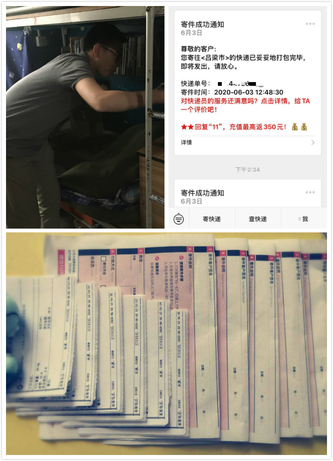 大一至大三年级班主任进入文瀛一、二、九、十号楼和文澜一、二号楼30余间宿舍化身“快递员”,为30名学生邮寄电脑、考研复习资料、期末考试书籍等必需物品。