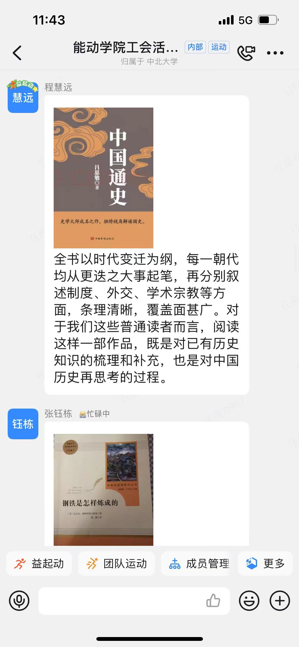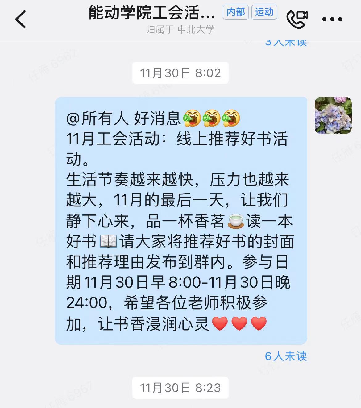 作为一名高校教师,多读书是提高教育教学质量的有效途径。读书可以让人知识丰富,读书可以让人彬彬有礼,读书可以让人聪明睿智,读书可以让人心情愉快。每位教师在工会群内互相推荐喜爱的书籍,写出了推荐理由和读这本书的感受,既丰富了知识,也开阔了视野,让每一位教师与书为伴,用书香浸润心灵。本次活动共推荐92本书目,既有《平凡的世界》、《活着》等文学作品,也有《易经》、《中国通史》等经典古籍,还有《梁启超传》、《曾国藩传》等人物传记,内容涵盖广泛。