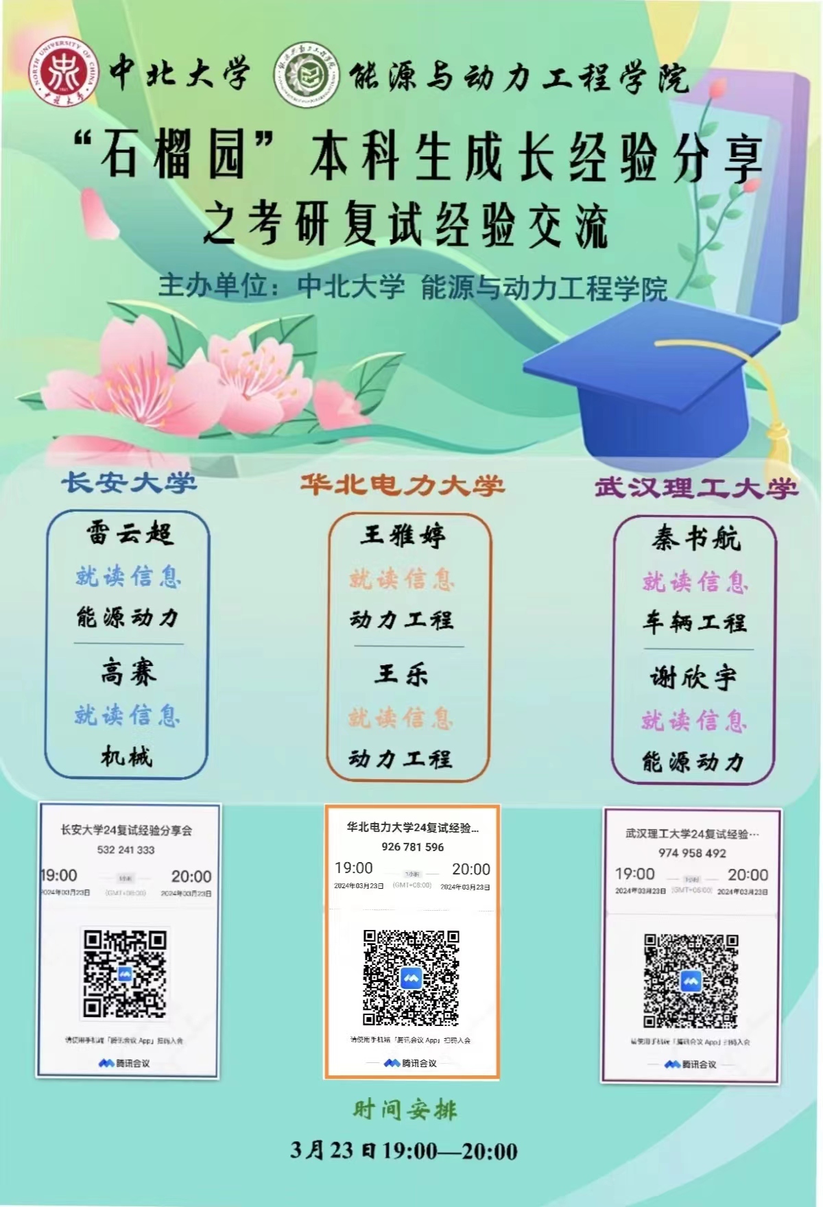 于3月23日晚在腾讯会议通过线上开展“石榴园”成长经验系列分享之考研复试经验交流。本次交流邀请到现已就读长安大学、武汉理工大学、华北电力大学(保定&北京)的2023届在线老虎机
