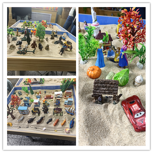 活动开始前,院党委副书记任雁指出,沙盘借助游戏形式把集体协助、团队合作寓于其中。她希望大家在讲述彼此故事、倾听彼此心声的过程中,加强彼此交流、增强团队凝聚力,不断提高辅导员队伍做好学生心理工作的能力,扮演好人生导师和知心朋友的角色。随后,工作室负责人李晓彧向各位老师介绍了沙盘游戏活动方法,说明各类沙具、沙子的使用规则,随后引导各位辅导员轮流操作。辅导员们严格按照沙盘游戏的要求,完成了自己的沙盘作品。沙盘摆放结束后,李老师与辅导员们一起,对沙盘世界进行探索,解析沙具选择与摆放位置背后的心理状态和心理意义。