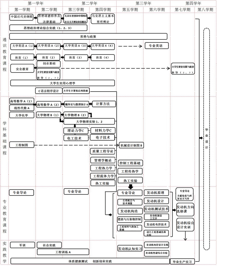 工程热力学、工程流体力学、工程传热学、控制工程基础、工程制图、机械设计基础、电工技术、电子技术、C语言程序设计、理论力学、材料力学、工程材料与热加工基础、A方向(燃烧与污染物控制、发动机构造、发动机原理、发动机设计、发动机制造工艺学、发动机测试技术、发动机电控技术)、B方向(材料结构与性能、新能源科学与工程基础、新能源物理器件基础、电化学基础、新能源动力测试技术、新能源热利用及系统、太阳能转化与应用系统、电池及动力控制系统)。